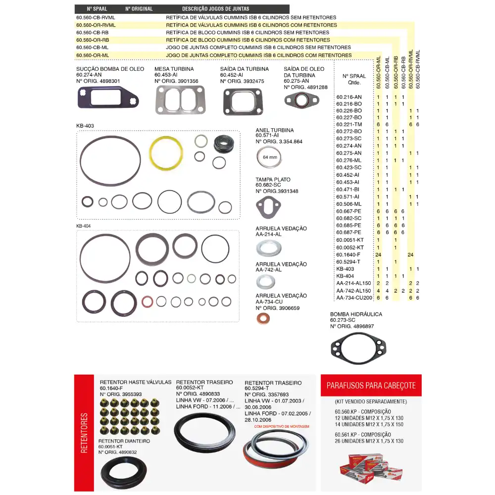 JOGO DE JUNTAS SUPERIOR COM RETENTOR SUPERIOR SPAAL - 60.560-OR-RVML